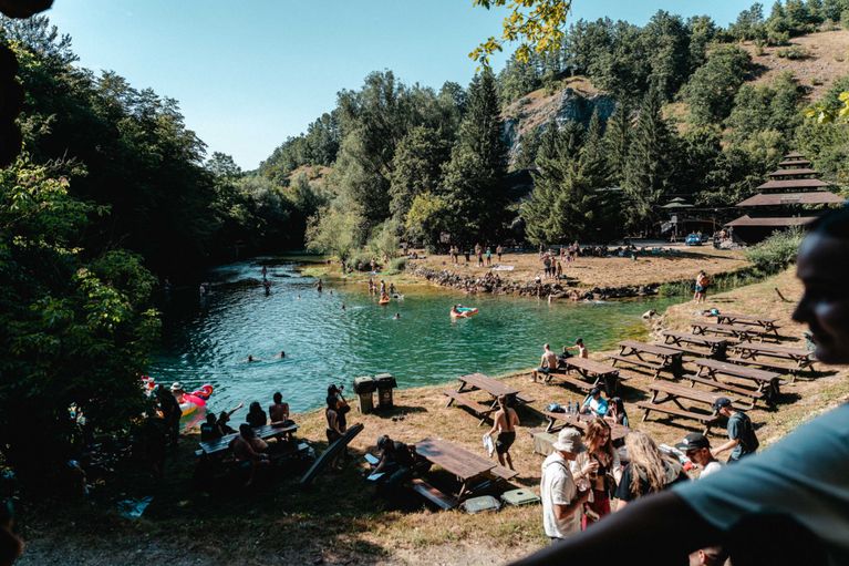 - Besonders eindrucksvoll ist die einzigartige Naturkulisse und atemberaubende Landschaft, die das Festival umgibt. Der Fluss Mrežnica ist nicht nur einer der saubersten Flüsse Kroatiens, sondern lädt auch zum Baden und Entspannen ein, der angrenzende Wald spendet tagsüber den nötigen Schatten